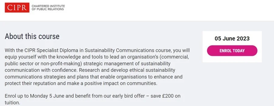 This is a wonderful brand-new course that can be ideal for professionals working in PR, corporate communication, marketing communication, internal communication, public affairs, or media relations, who want to learn more about how to advise on sustainability communication with confidence. The price is £2,043 (with easy installments available)